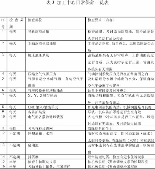 常用的數(shù)控機(jī)床切削精度檢測驗(yàn)收內(nèi)容如表2下附上某加工中心日常保養(yǎng)維護(hù)(表3),以供制訂有關(guān)保養(yǎng)制度時參考。